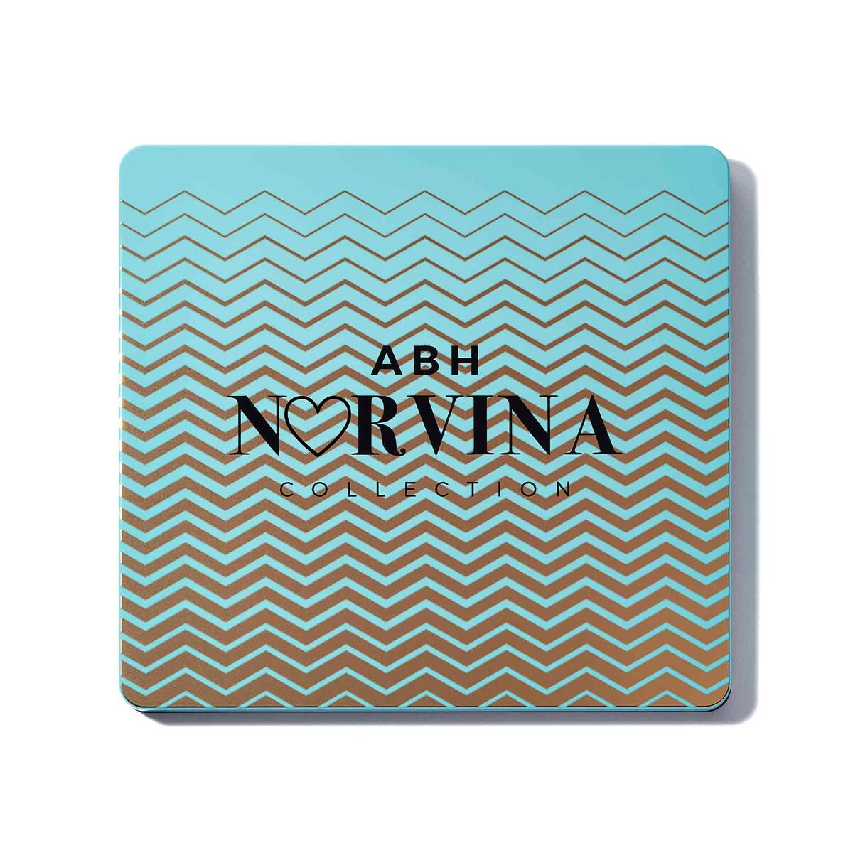 Advanced artistry palette housed inside a beautiful, square-cut, seafoam-green case with gold mermaid-like accents and the ABH x NORVINA® logo on the outside and an extra-large mirror on the inside